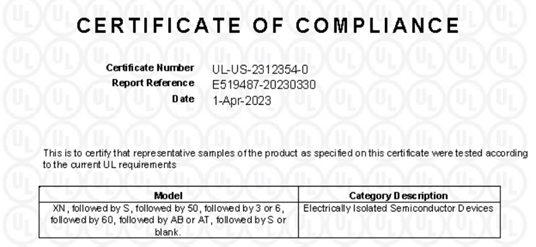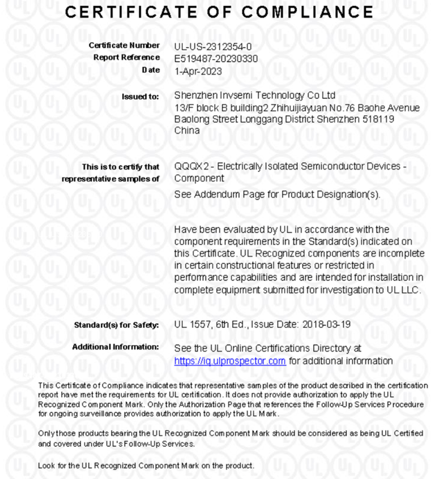 芯能IPM23全系列產(chǎn)品通過(guò)了UL1557:2018標準規定的各項測試,并獲得UL公司頒發(fā)的UL1557認證證書(shū)(File NO:E519487)。